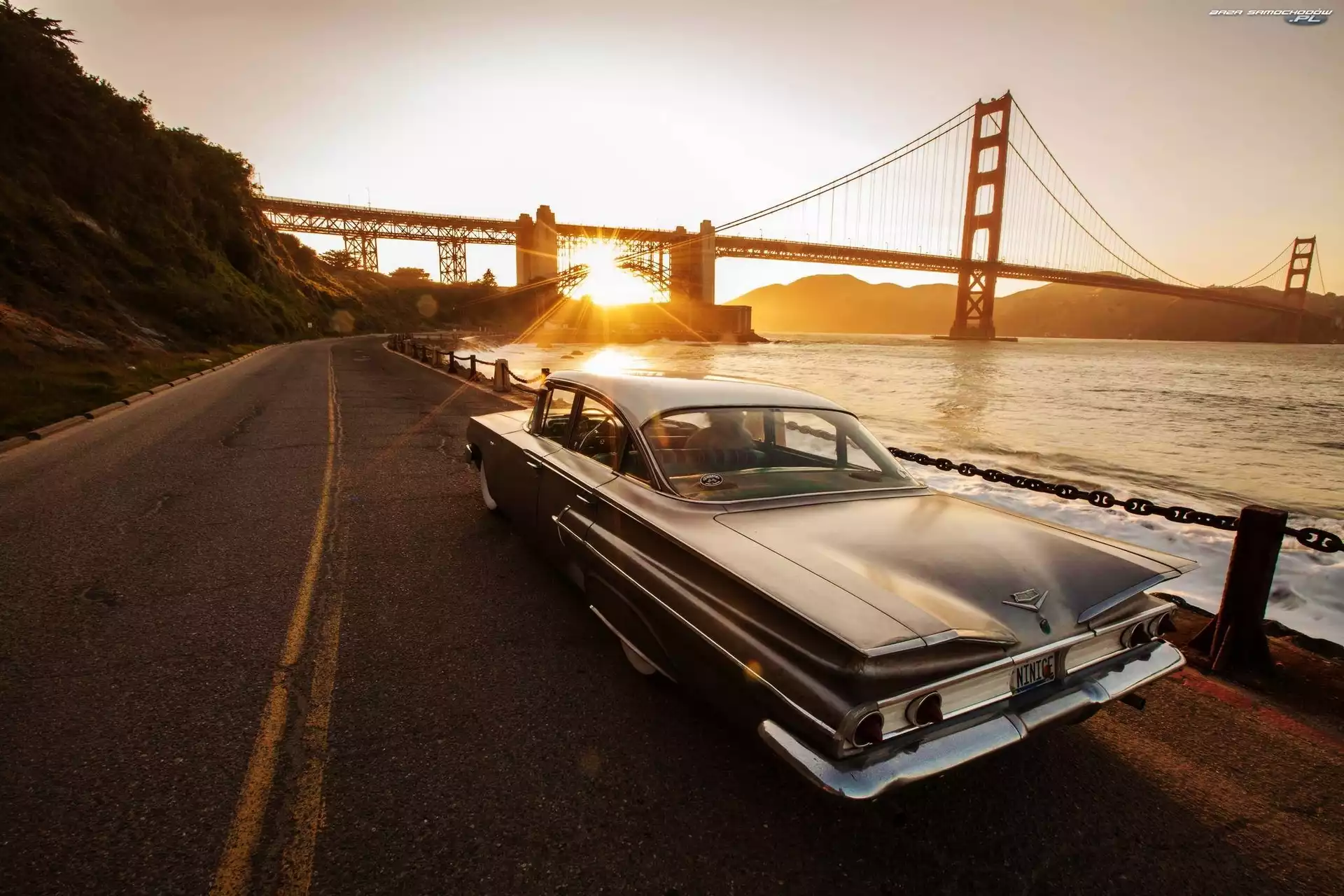 Samochód: Droga, Most, Słońca, Zachód, Cadillac